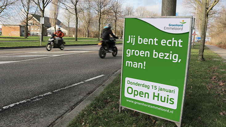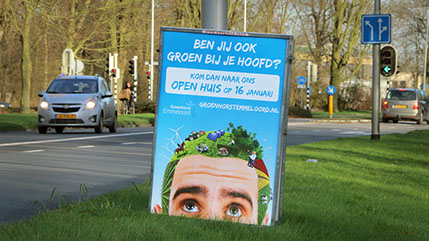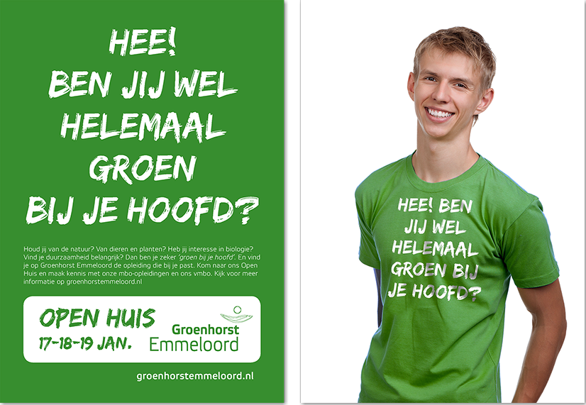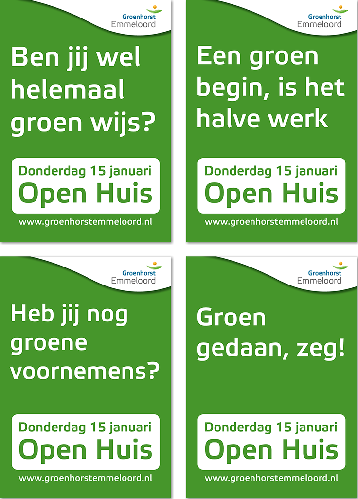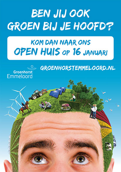 Groenhorst College Emmeloord vroeg Bureau Meneer Creëer om met een eenvoudige maar opvallende campagne te komen die de jeugd zou aanspreken en nieuwsgierig zou maken naar de 'Open Huis'-dag. Meneer Creëer bedacht hiervoor de uitdagende campagne-slogan: Ben jij wel helemaal groen bij je hoofd?