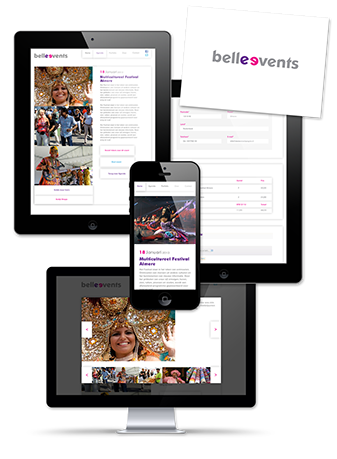 Belle Events organiseert events en feesten, met nadruk op multi-culturele ontmoetingen. Door de twee e's in de naam te kleuren en de tweede e te spiegelen ontstaat er een ontmoeting. Het vrolijke karakter hiervan wordt benadrukt door het gekozen lettertype, waarbij de e's staan voor lachende en pratende mensen.