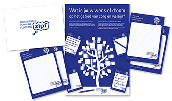 Ook ontwierp Bureau Meneer Creëer een de poster en kaarten voor een actie van ZIPF tijdens de Nationale Week van Zorg en Welzijn. Hiermee werden voorbijgangers gevraagd om hun wens op het gebied van zorg in een wensboom te hangen...